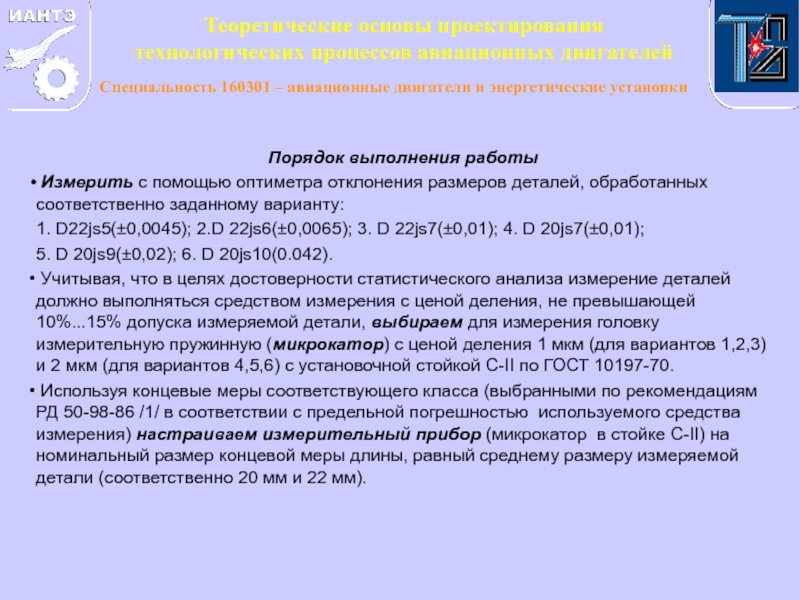 Учитывая, что в целях достоверности статистического анализа измерение деталей должно выполняться средством измерения с ценой деления, не превышающей 10%...15% допуска измеряемой детали, выбираем для измерения головку измерительную пружинную (микрокатор) с ценой деления 1 мкм (для вариантов 1,2,3) и 2 мкм (для вариантов 4,5,6) с установочной стойкой С-II по ГОСТ 10197-70.