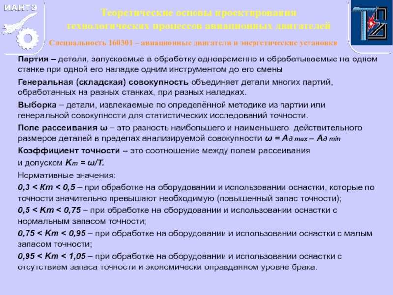0,95 < Kт < 1,05 – при обработке на оборудовании и использовании оснастки с отсутствием запаса точности и экономически оправданном уровне брака.