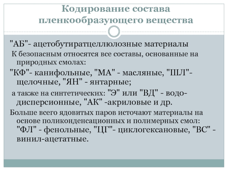 Больше всего ядовитых паров источают материалы на основе поликонденсационных и полимерных смол: "ФЛ" - фенольные, "ЦГ"- циклогексановые, "ВС" - винил-ацетатные.