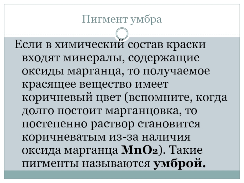 то получаемое красящее вещество имеет коричневый цвет (вспомните, когда долго постоит марганцовка, то постепенно раствор становится коричневатым из-за наличия оксида марганца MnO2). Такие пигменты называются умброй.