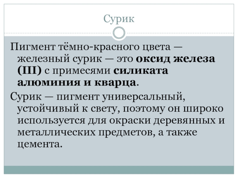 Сурик — пигмент универсальный, устойчивый к свету, поэтому он широко используется для окраски деревянных и металлических предметов, а также цемента.