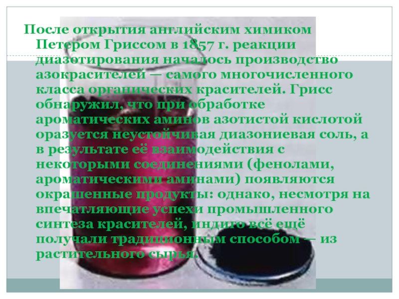 началось производство азокрасителей — самого многочисленного класса органических красителей. Грисс обнаружил, что при обработке ароматических аминов азотистой кислотой оразуется неустойчивая диазониевая соль, а в результате её взаимодействия с некоторыми соединениями (фенолами, ароматическими аминами) появляются окрашенные продукты: однако, несмотря на впечатляющие успехи промышленного синтеза красителей, индиго всё ещё получали традиционным способом — из растительного сырья.