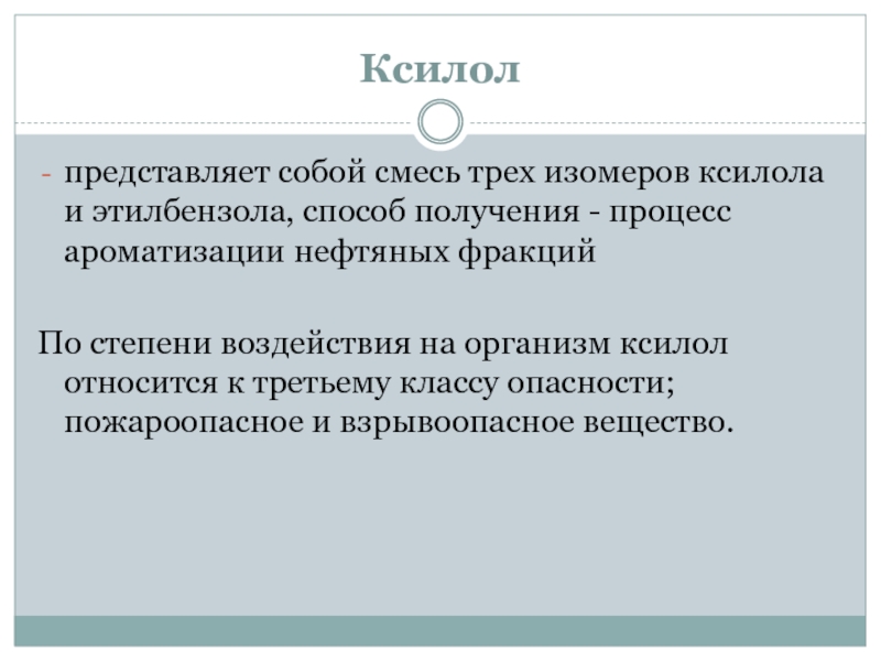 По степени воздействия на организм ксилол относится к третьему классу опасности; пожароопасное и взрывоопасное вещество.