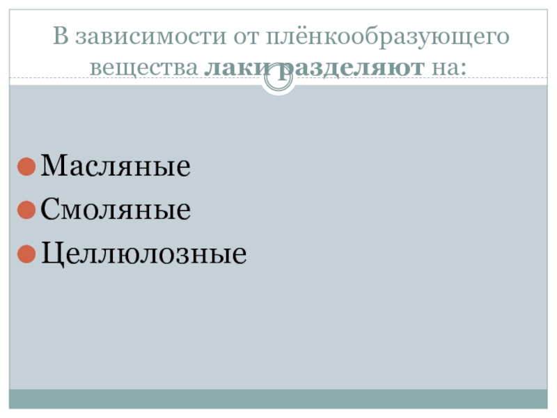 Слайд 34 В зависимости от плёнкообразующего вещества лаки разделяют на: