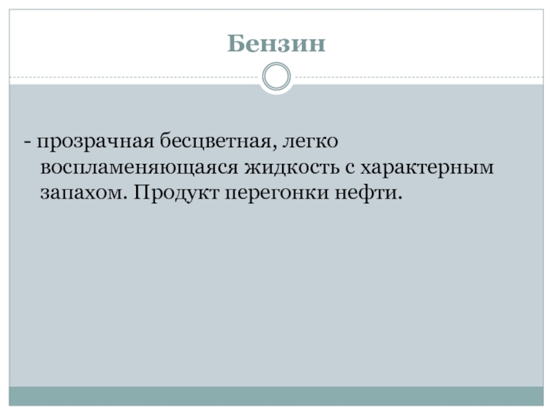 - прозрачная бесцветная, легко воспламеняющаяся жидкость с характерным запахом. Продукт перегонки