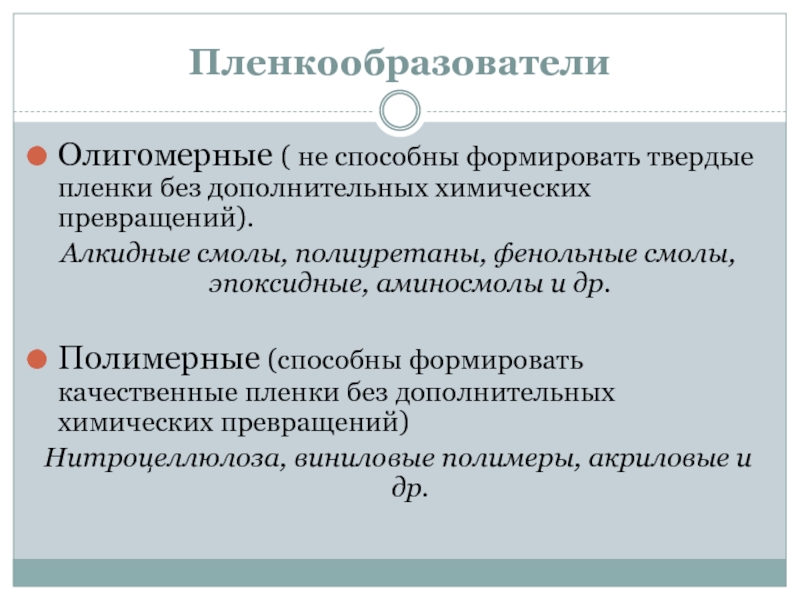 Олигомерные ( не способны формировать твердые пленки без дополнительных химических превращений).