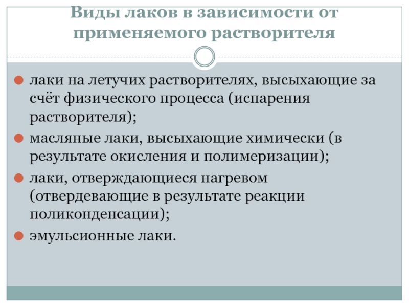 Слайд 43Виды лаков в зависимости от применяемого растворителя