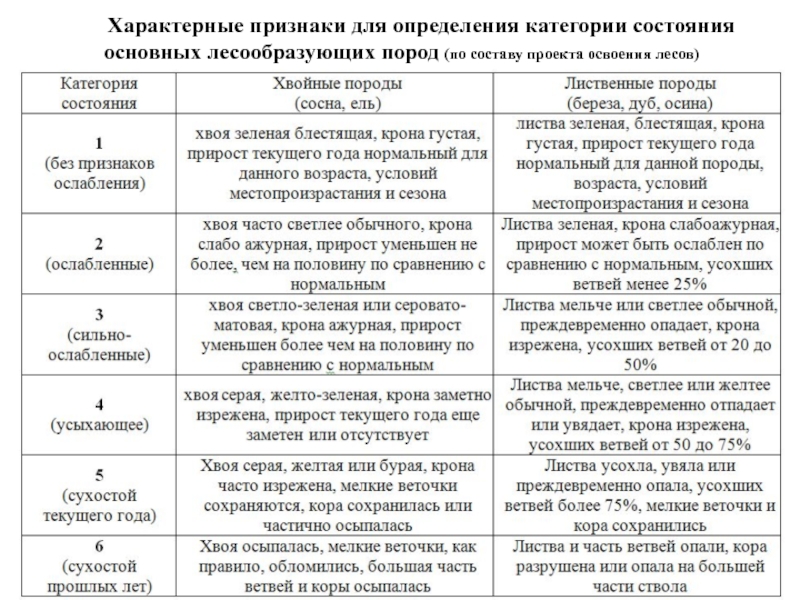 Слайд 3Характерные признаки для определения категории состояния основных лесообразующих пород (по составу