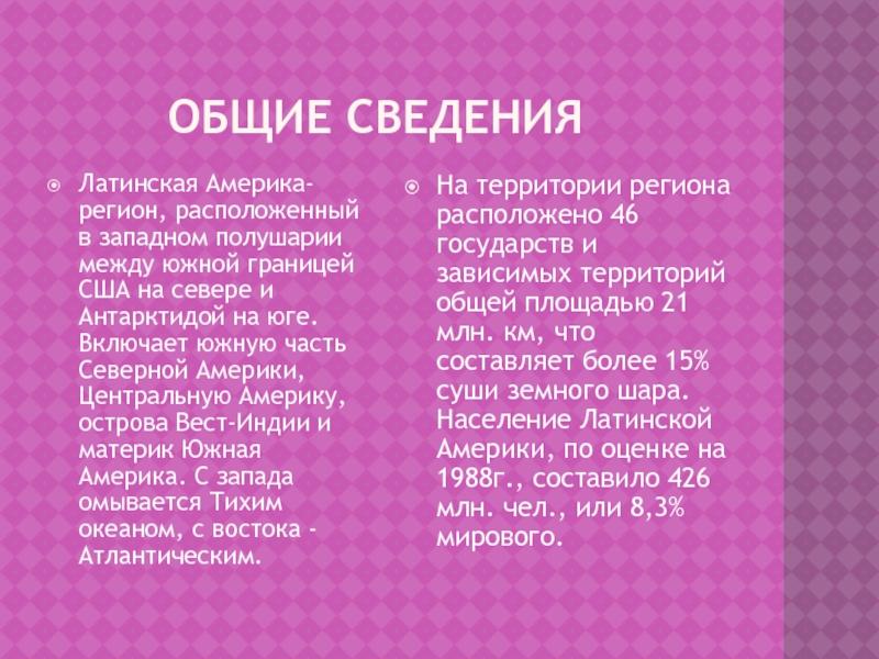 На территории региона расположено 46 государств и зависимых территорий общей площадью 21 млн. км, что составляет более 15% суши земного шара. Население Латинской Америки, по оценке на 1988г., составило 426 млн. чел., или 8,3% мирового.