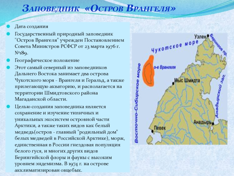 Этот самый северный из заповедников Дальнего Востока занимает два острова Чукотского моря - Врангеля и Геральд, а также прилегающую акваторию, и располагается на территории Шмидтовского района Магаданской области.