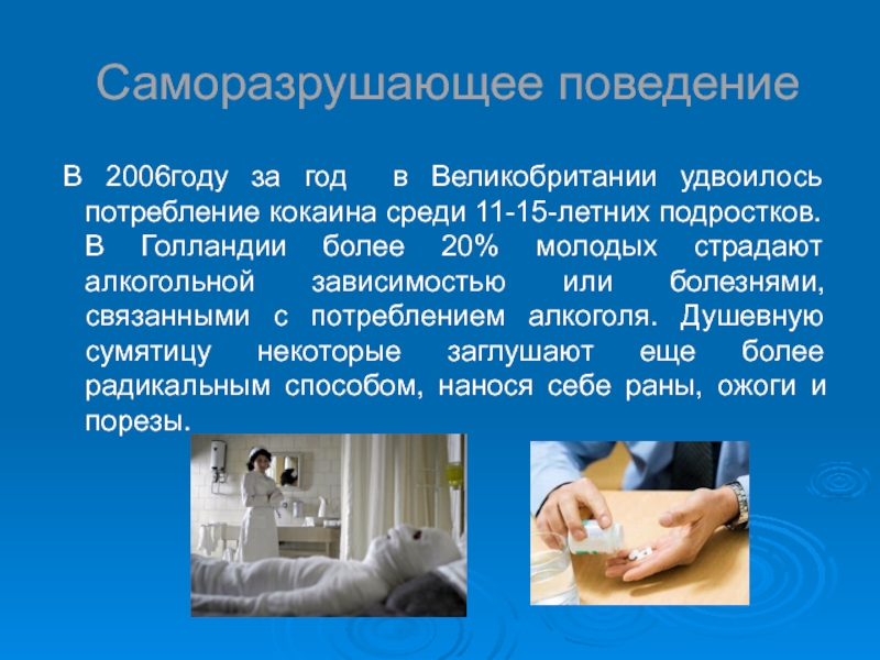 11-15-летних подростков. В Голландии более 20% молодых страдают алкогольной зависимостью или болезнями, связанными с потреблением алкоголя. Душевную сумятицу некоторые заглушают еще более радикальным способом, нанося себе раны, ожоги и порезы.