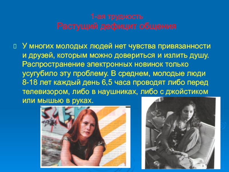 друзей, которым можно довериться и излить душу. Распространение электронных новинок только усугубило эту проблему. В среднем, молодые люди 8-18 лет каждый день 6,5 часа проводят либо перед телевизором, либо в наушниках, либо с джойстиком или мышью в руках.