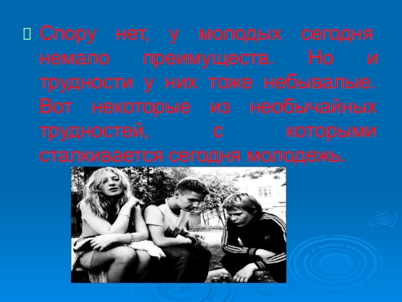 Слайд 3Спору нет, у молодых сегодня немало преимуществ. Но и трудности у