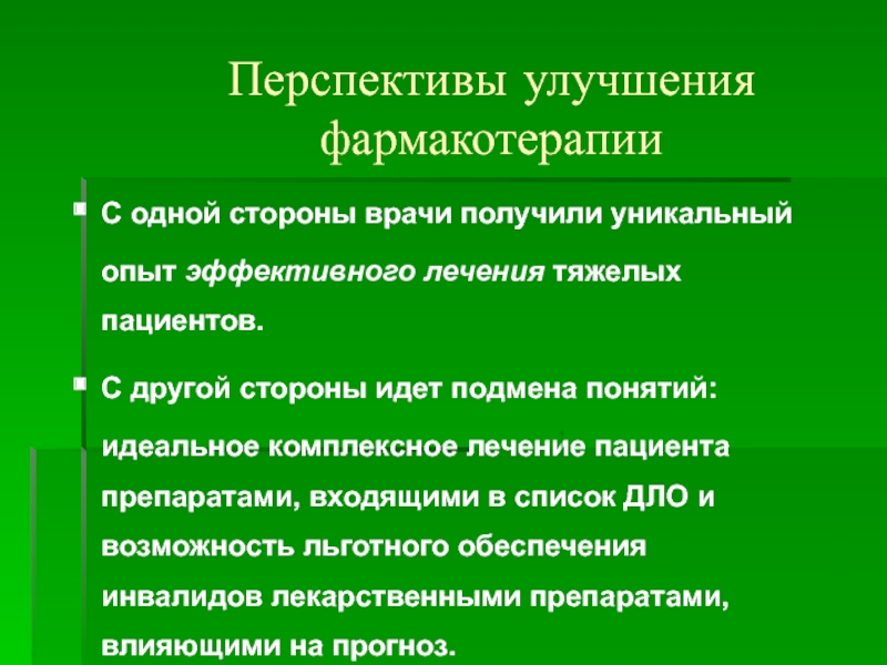 С другой стороны идет подмена понятий: идеальное комплексное лечение пациента препаратами, входящими в список ДЛО и возможность льготного обеспечения инвалидов лекарственными препаратами, влияющими на прогноз.