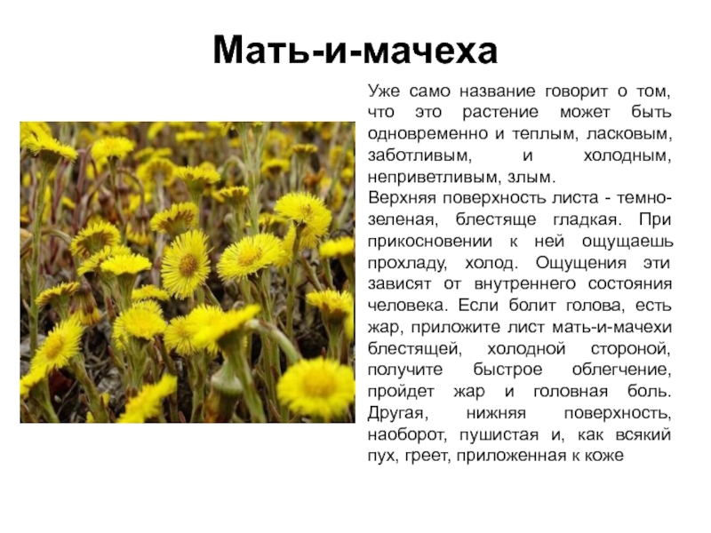 Мать-и-мачеха обладает сильным противовоспалительным действием. Она быстро снимает аллергические реакции
