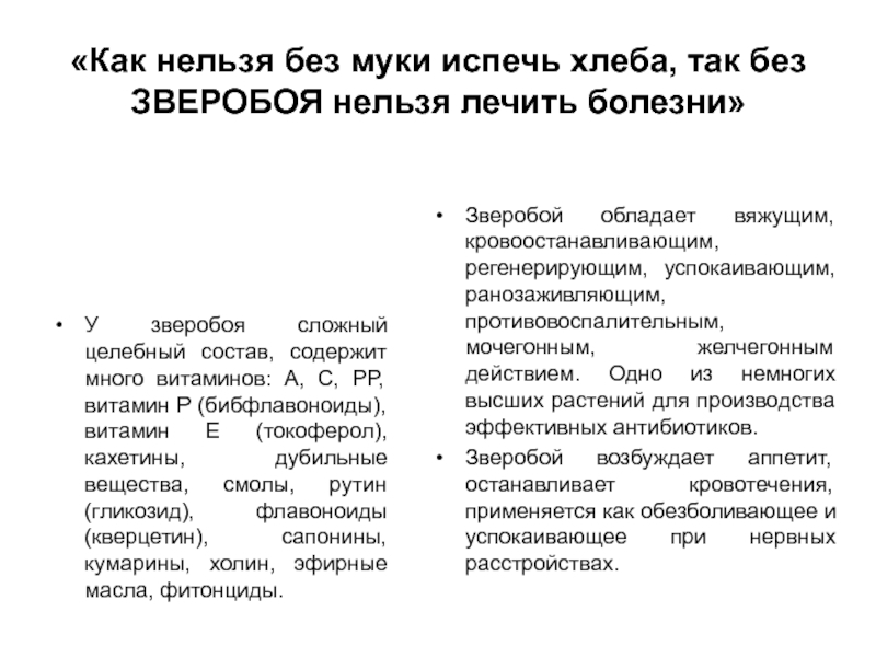 У зверобоя сложный целебный состав, содержит много витаминов: A, C, PP, витамин P (бибфлавоноиды), витамин Е (токоферол), кахетины, дубильные вещества, смолы, рутин (гликозид), флавоноиды (кверцетин), сапонины, кумарины, холин, эфирные масла, фитонциды.