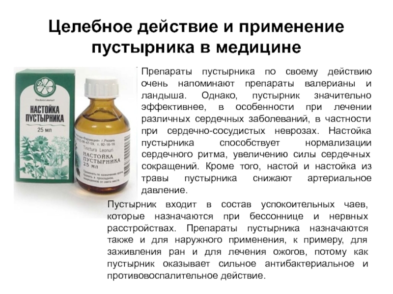Пустырник входит в состав успокоительных чаев, которые назначаются при бессоннице и нервных расстройствах. Препараты пустырника назначаются также и для наружного применения, к примеру, для заживления ран и для лечения ожогов, потому как пустырник оказывает сильное антибактериальное и противовоспалительное действие.