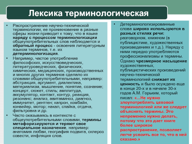 Детерминологизированные слова широко используются в разных стилях речи: разговорном, книжном (в публицистике, художественных произведениях и т.д.). Наряду с ними нередко употребляются профессионализмы и термины. Однако чрезмерное насыщение художественных, публицистических произведений научно-технической терминологией снижает их ценность и было осуждено еще в конце 20-х и в начале 30-х годов А.М. Горьким, который писал: «...Не нужно злоупотреблять цеховой терминологией или же следует объяснять термины. Это непременно нужно делать, потому что это дает книге более широкое распространение, позволяет легче усвоить все то, что в ней сказано.»