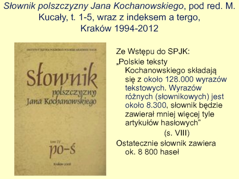 Obejmuje całe słownictwo użyte przez J. Kochanowskiego w polskich utworach.