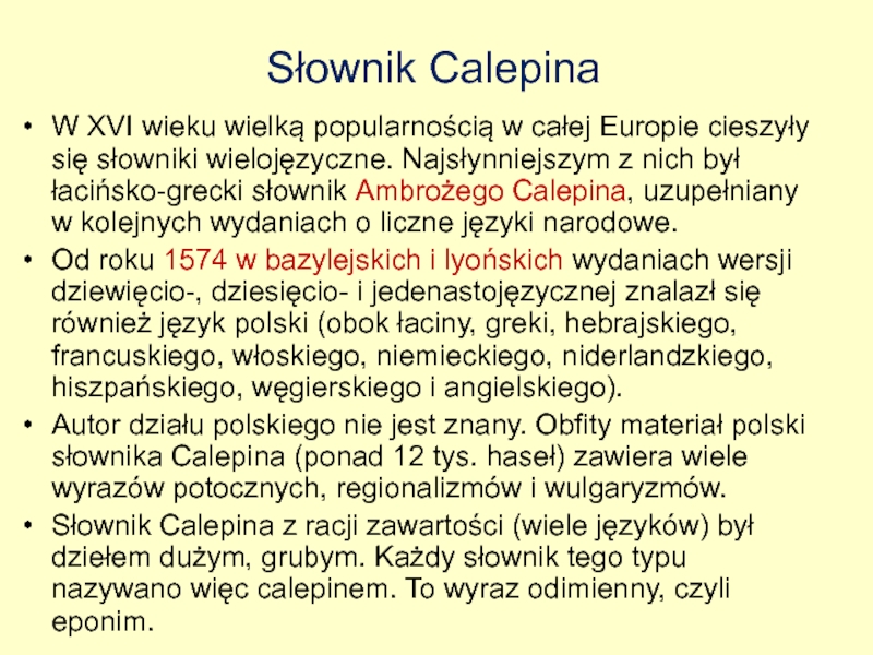 słowniki wielojęzyczne. Najsłynniejszym z nich był łacińsko-grecki słownik Ambrożego Calepina, uzupełniany w kolejnych wydaniach o liczne języki narodowe.