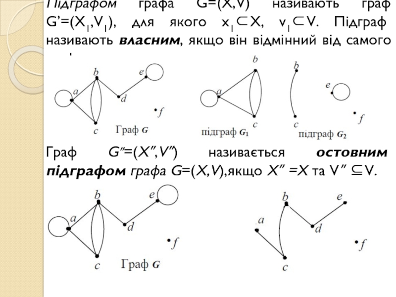 Слайд 11Підграфом графа G=(X,V) називають граф G’=(X1,V1), для якого х1⊂X, v1⊂V. Підграф