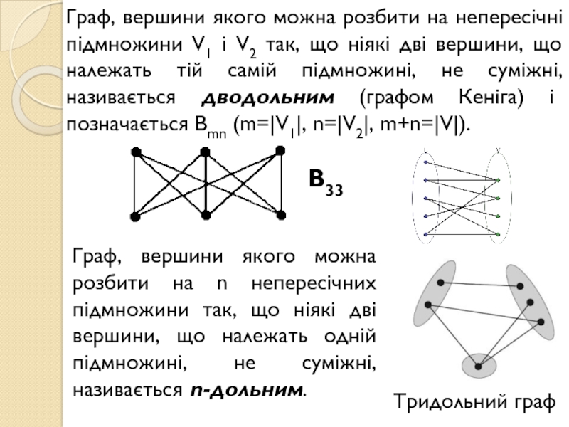 так, що ніякі дві вершини, що належать тій самій підмножині, не суміжні, називається дводольним (графом Кеніга) і позначається Bmn (m=|V1|, n=|V2|, m+n=|V|).