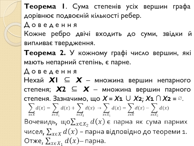 Слайд 8Теорема 1. Сума степенів усіх вершин графа дорівнює подвоєній кількості ребер.