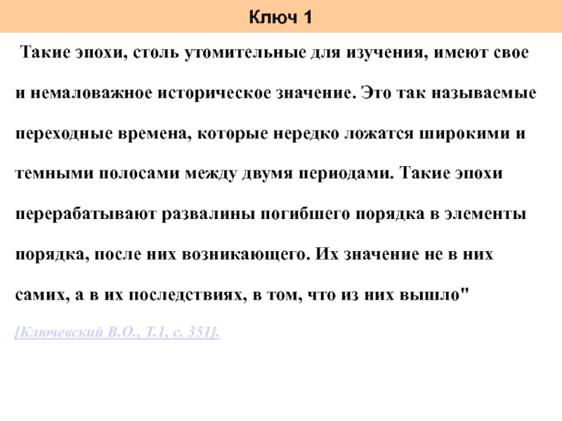 немаловажное историческое значение. Это так называемые переходные времена, которые нередко ложатся широкими и темными полосами между двумя периодами. Такие эпохи перерабатывают развалины погибшего порядка в элементы порядка, после них возникающего. Их значение не в них самих, а в их последствиях, в том, что из них вышло" [Ключевский В.О., Т.1, с. 351].