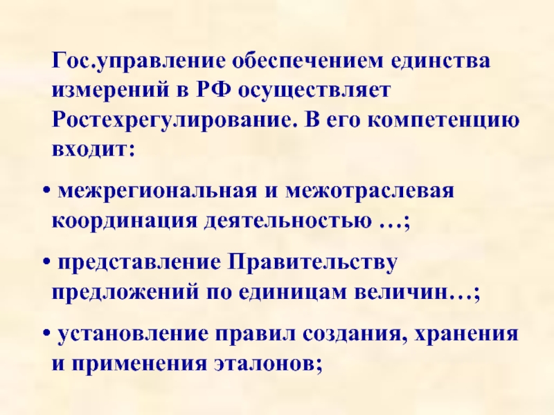 Слайд 7Гос.управление обеспечением единства измерений в РФ осуществляет Ростехрегулирование. В его компетенцию