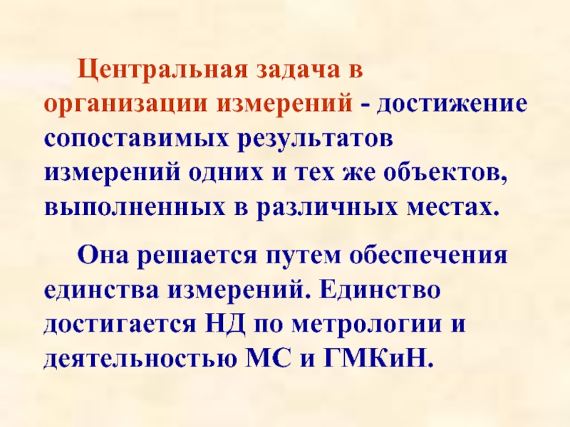 Слайд 6Центральная задача в организации измерений - достижение сопоставимых результатов измерений одних