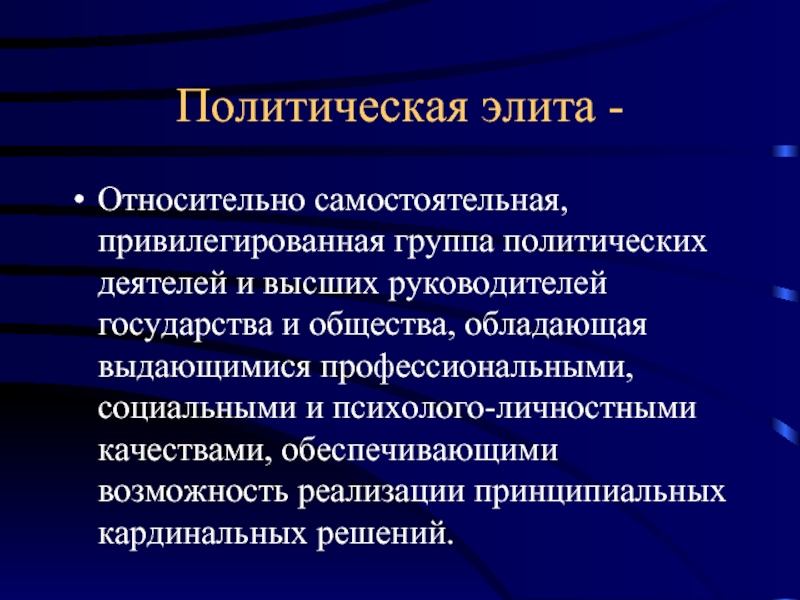руководителей государства и общества, обладающая выдающимися профессиональными, социальными и психолого-личностными качествами, обеспечивающими возможность реализации принципиальных кардинальных решений.