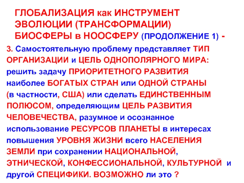 Слайд 25ГЛОБАЛИЗАЦИЯ как ИНСТРУМЕНТ ЭВОЛЮЦИИ (ТРАНСФОРМАЦИИ) БИОСФЕРЫ в НООСФЕРУ (ПРОДОЛЖЕНИЕ 1) -