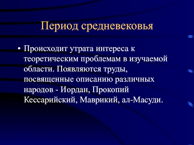 труды, посвященные описанию различных народов - Иордан, Прокопий Кессарийский, Маврикий, ал-Масуди.