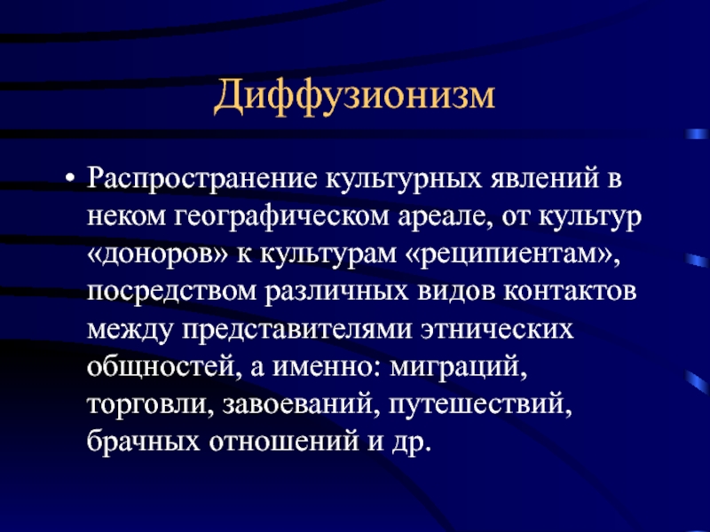 культурам «реципиентам», посредством различных видов контактов между представителями этнических общностей, а именно: миграций, торговли, завоеваний, путешествий, брачных отношений и др.