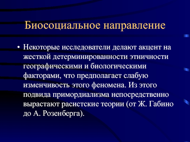 биологическими факторами, что предполагает слабую изменчивость этого феномена. Из этого подвида примордиализма непосредственно вырастают расистские теории (от Ж. Габино до А. Розенберга).