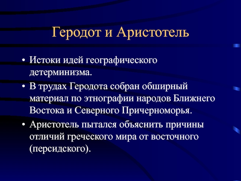Аристотель пытался объяснить причины отличий греческого мира от восточного (персидского).