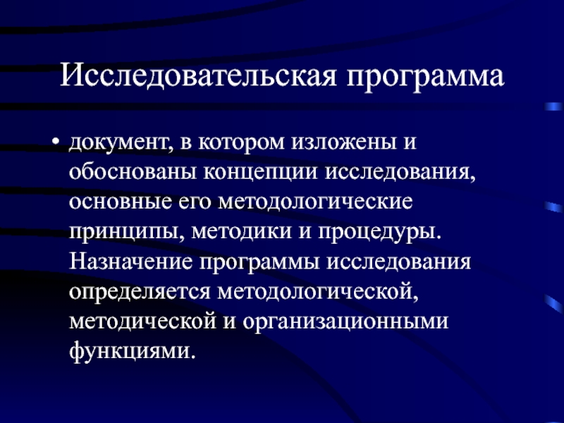его методологические принципы, методики и процедуры. Назначение программы исследования определяется методологической, методической и организационными функциями.