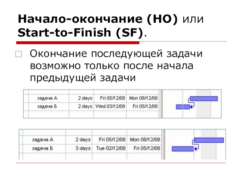 Слайд 21Начало-окончание (НО) или Start-to-Finish (SF).