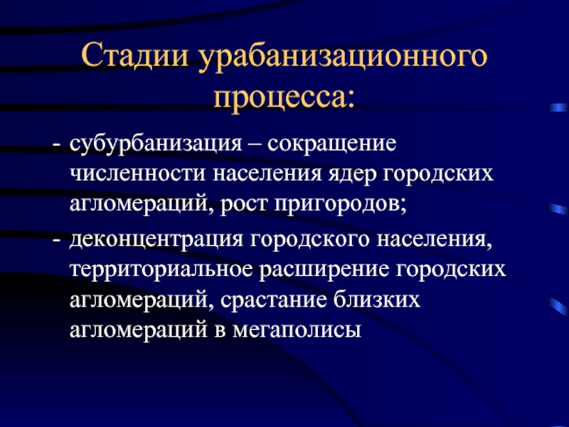 деконцентрация городского населения, территориальное расширение городских агломераций, срастание близких агломераций в мегаполисы