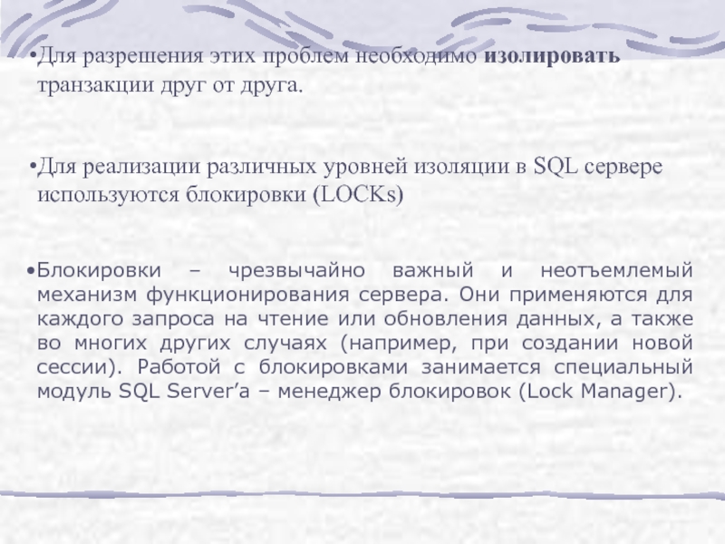 Слайд 5Для разрешения этих проблем необходимо изолировать транзакции друг от друга.