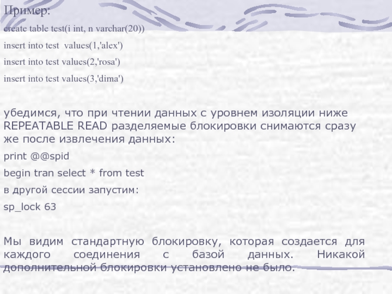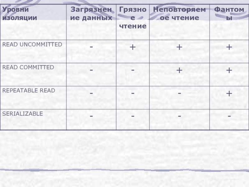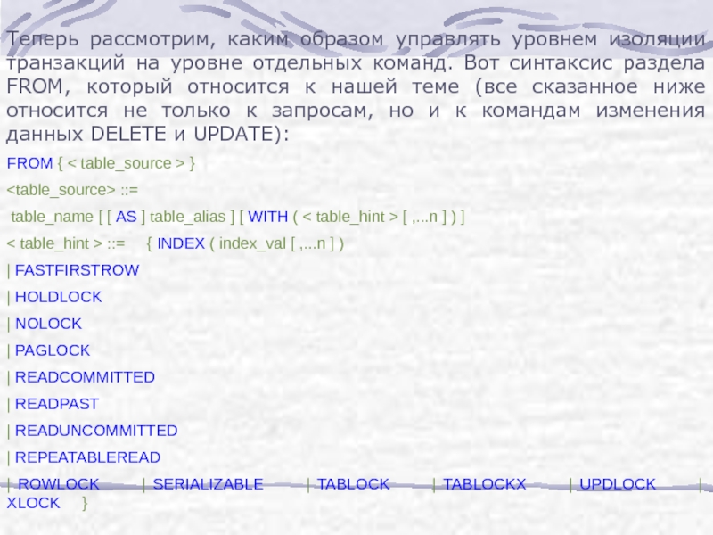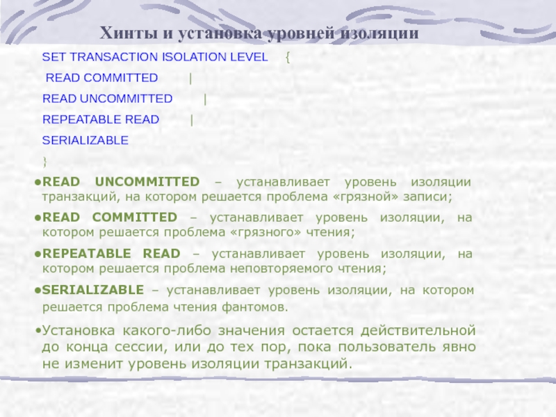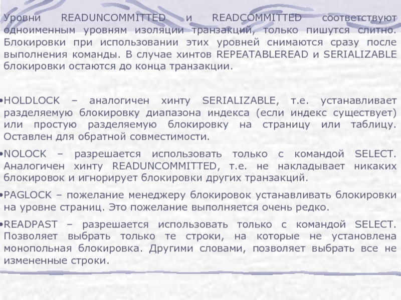 Слайд 32Уровни READUNCOMMITTED и READCOMMITTED соответствуют одноименным уровням изоляции транзакций, только пишутся