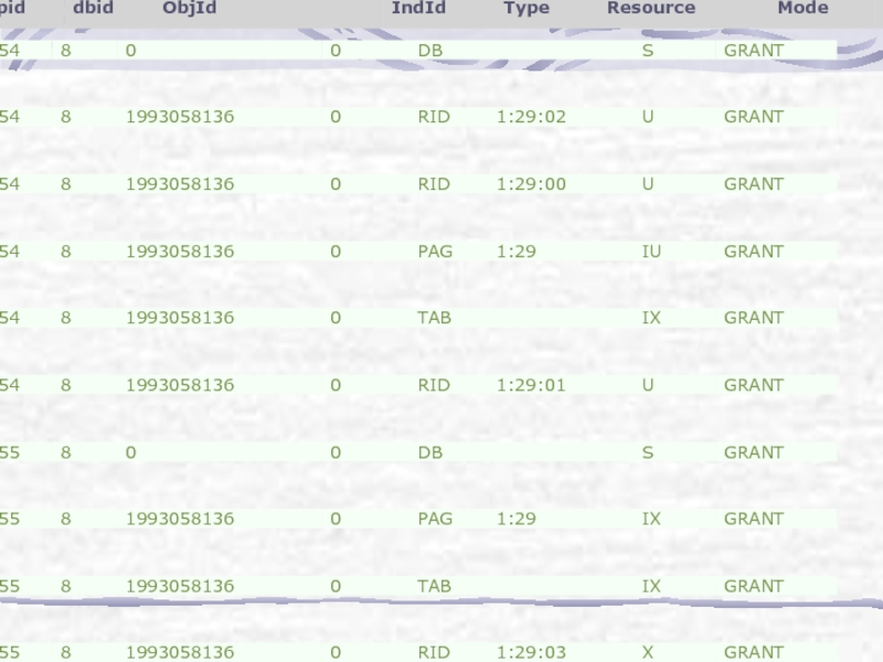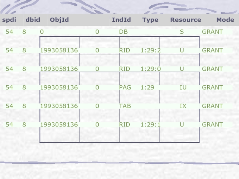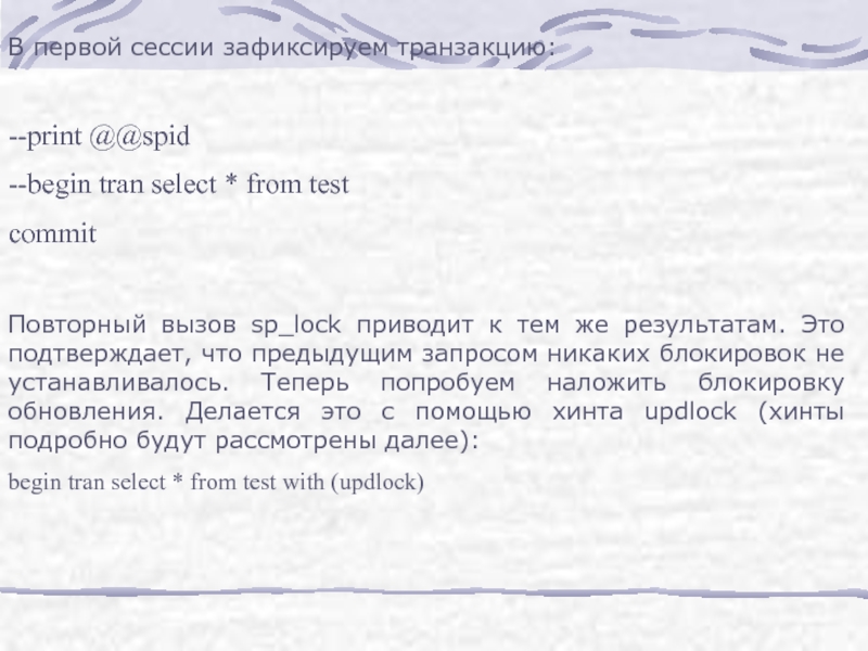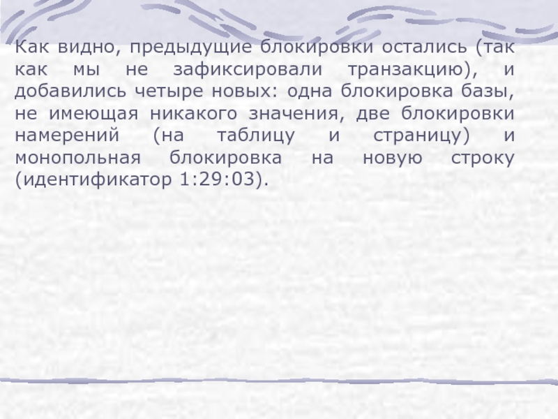 Слайд 26Как видно, предыдущие блокировки остались (так как мы не зафиксировали транзакцию),