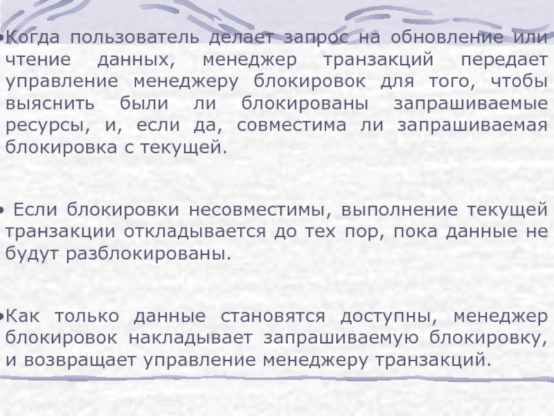 Как только данные становятся доступны, менеджер блокировок накладывает запрашиваемую блокировку, и возвращает управление менеджеру транзакций.