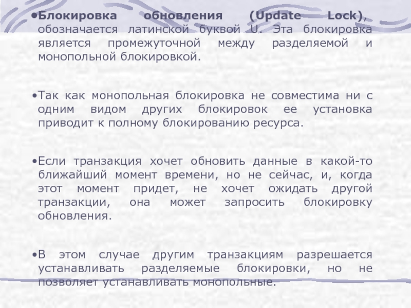 Слайд 17Блокировка обновления (Update Lock), обозначается латинской буквой U. Эта блокировка является