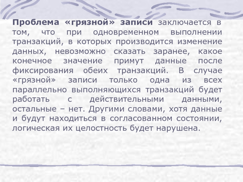 Слайд 2Проблема «грязной» записи заключается в том, что при одновременном выполнении транзакций,