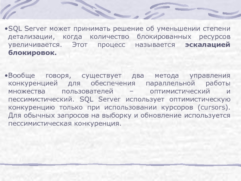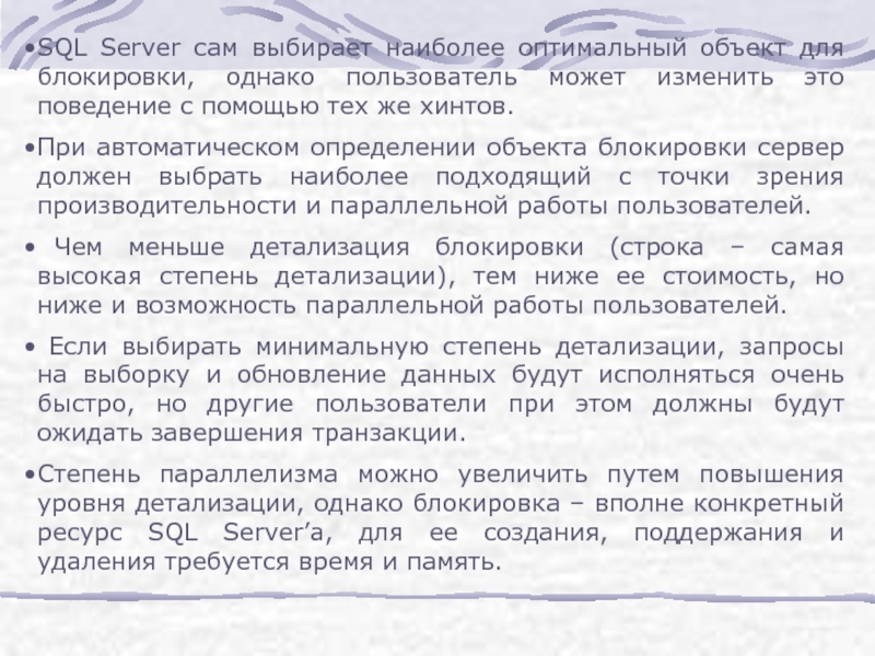 Слайд 11SQL Server сам выбирает наиболее оптимальный объект для блокировки, однако пользователь