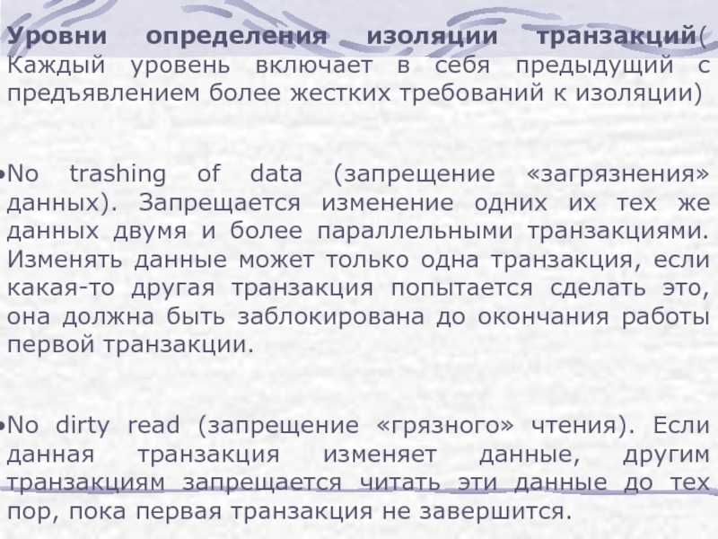 Слайд 6Уровни определения изоляции транзакций( Каждый уровень включает в себя предыдущий с