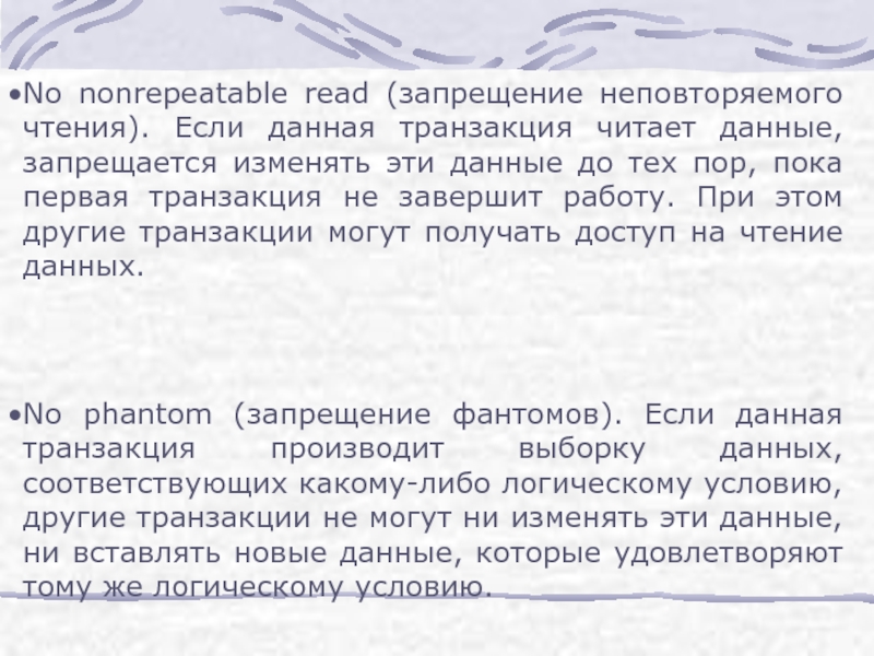 No phantom (запрещение фантомов). Если данная транзакция производит выборку данных, соответствующих какому-либо логическому условию, другие транзакции не могут ни изменять эти данные, ни вставлять новые данные, которые удовлетворяют тому же логическому условию.