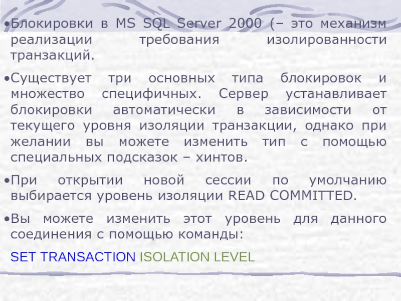 Слайд 8Блокировки в MS SQL Server 2000 (– это механизм реализации требования