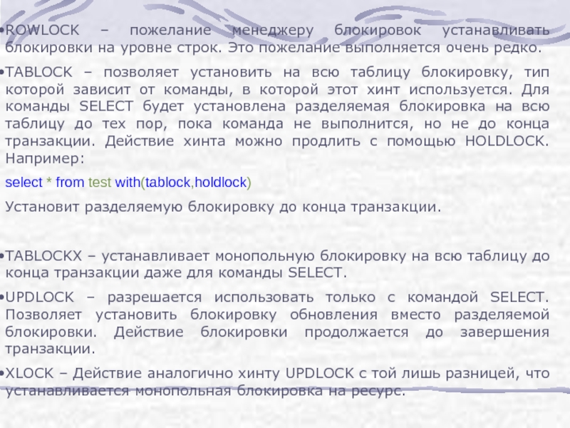 Слайд 33ROWLOCK – пожелание менеджеру блокировок устанавливать блокировки на уровне строк. Это